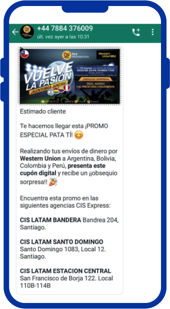 Envío de notificaciones vía canal WhatsApp MKT a clientes para el envío de dinero a países de Latinoamerica.